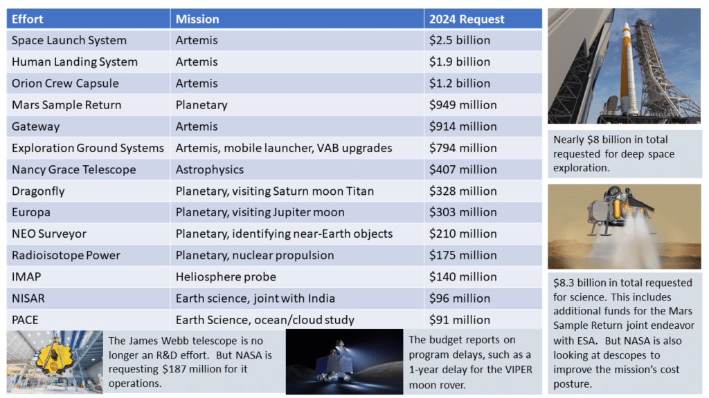 NASA is proposing a $27 billion budget for next fiscal year, nearly $2 billion more than what was enacted for fiscal year 2023. Deep space exploration and the Artemis programs command nearly $8 billion of the budget and science programs command about $8.3 billion. The programs requesting the largest amounts of funding include the major Artemis-related efforts, such as the Space Launch System and the Human Landing System and Planetary missions such as Mars Sample Return and the Jupiter moon explorer, Europa. While this is a significant increase, NASA is still finding itself prioritizing missions in light of cost increases and resource constraints.