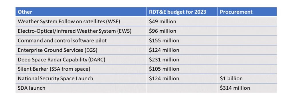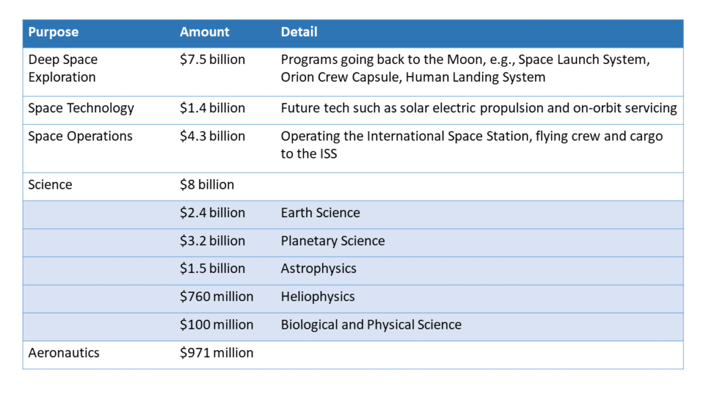 Money is also appropriated to NOAA for weather satellites, Department of Energy for some space-related technology development, and of course, the intelligence community, among other space-related activity.